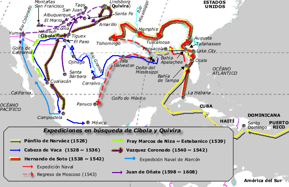 Los náufragos de la expedición de Pánfilo de Narváez de 1528: Alvar Nuñez Cabeza de Vaca, Dorantes, Castillo, y el africano Estebanico, recorrieron durante 7 años, los territorio del sur de Estados Unidos. Ellos relataron ciudades maravillosas ubicadas al norte de Nueva España.